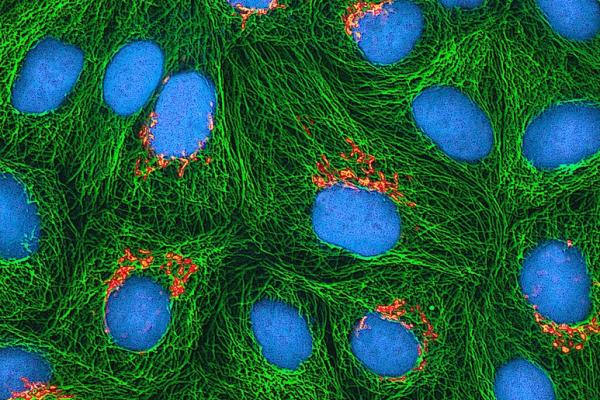 Hình ảnh huỳnh quang đa photon môi trường nuôi cấy tế bào Hela với protein huỳnh quang được gắn với thể Golgi (màu da cam), vi ống (màu xanh lá cây) và ADN (màu xanh da trời).